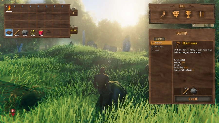 Nadat je dit gedaan hebt, wordt het tijd om de eerste stappen richting het overleven te zetten. Het enige wat je krijgt, is een tuniek en een fakkel, dus voor de rest zul je toch echt zelf moeten zorgen. Dit doe je door simpelweg de stenen en stukken hout die op de grond liggen op te rapen. Je kunt het beste zoveel mogelijk verzamelen, want je zult het hard nodig gaan hebben. Wanneer je vijf hout en vier stenen hebt verzameld, is het mogelijk om de stenen bijl te maken. Via Tab kom je eenvoudig bij het crafting-menu en je rugzak. De stenen bijl is nodig om snel hout te verzamelen, omdat je nu de grote bomen kunt omhakken. De kleine struiken kun je met blote handen kapot slaan, maar met een bijl gaat het net wat sneller. Je kunt er daarna voor kiezen om de club te maken. Dit wapen kost zes hout en is geschikt voor het verslaan van de Greylings, maar je kunt ook gewoon de stenen bijl gebruiken. Je hebt nu de gereedschappen om snel hout te verzamelen en vijanden van je af te houden, waardoor de hamer de volgende stap is. De hamer kost drie hout en twee steen en geeft je de mogelijkheid om een vuur, werkbank en uiteindelijk een huis te bouwen. Het vuur heb je nodig om warm te blijven in de avond, dus daar kun je nog even mee wachten.