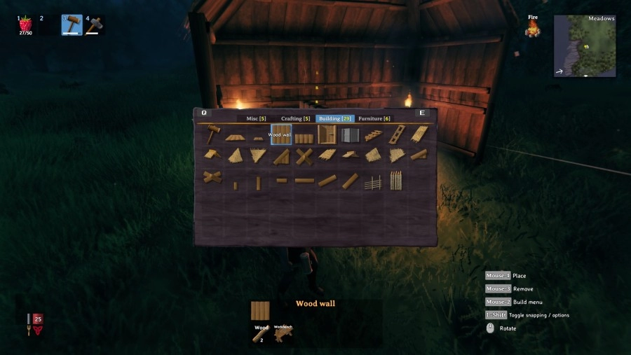 Het eerste huis dat je gaat bouwen hoeft niet direct super fancy te zijn. Het belangrijkste van je eerste huis is namelijk dat de werkbank en het bed beschut zijn, want anders werken ze niet volledig. Zet dus gewoon een werkbank neer op de plek waar je het huis wilt hebben en bouw daar om heen. Dit doe je door de hamer te gebruiken en volgens op de rechter muisknop te drukken. Er zijn verschillende soorten balken, muren en rieten daken waaruit je kunt kiezen. Ik begin altijd met twee muurstukken op elkaar en plaats daar vervolgens een dak op, maar als je een lager huis wilt, is het ook mogelijk om een stuk muur te plaatsen en dan een klein dak er op te zetten. Om de werkbank te laten werken, hoef je alleen de achterkant en de zijkant van muren te voorzien. Zorg ervoor dat het dak over de werkbank heen hangt en klaar is Kees. Uiteraard is het handig om door te bouwen, want dan kun je ook het bed kwijt. Het bed wordt je nieuwe spawnpoint en in de avond kun je ervoor kiezen om te slapen. Valheim kent geen ramen, maar deze kun je zelf creëren door de halve muren te gebruiken samen met de balken. Naast de werkbank en het bed, is het vooral handig om zo snel mogelijk een kist of twee in het huis te zetten. Zo hoef je niet alles mee te slepen, wanneer je op zoek gaat naar andere grondstoffen. Ook het kampvuur kan gewoon geplaatst worden in je huis, al moet je er wel rekening mee houden dat je een gedeelte van de vloer moet verwijderen. Daarnaast heb je of een hoog dak nodig of een opening voor het vuur om te voorkomen dat je schade krijgt van de rook. Boven het vuur plaats je vervolgens het kookstation, zodat je het vlees kunt koken. Haal het vlees wel van het vuur af wanneer je een sissend geluid hoort, want anders hou je alleen houtskool over.