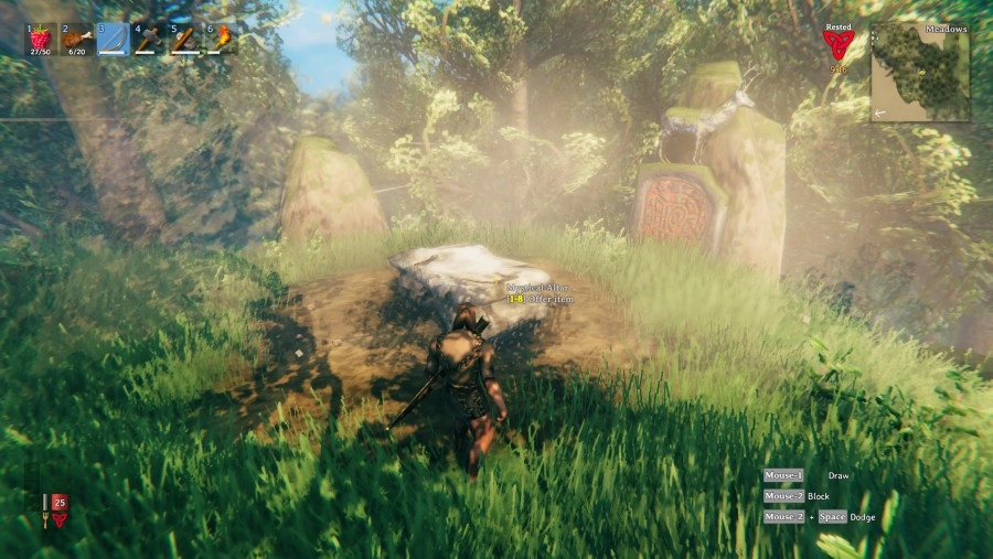 Ik gaf al aan dat het handig is om een eindje van het altaar van Eikthyr een nederzetting te bouwen. Dit voorkomt dat je per ongeluk het beest naar je nederzetting lokt en de gebouwen schade oplopen. Wanneer je de gereedschappen hebt gemaakt en wat voedsel in je bezit hebt, is het dan ook tijd om even rond te lopen. Blijf vooral alles oprapen wat je vindt. Het personage kan driehonderd gewicht dragen en straks maak je gewoon een kist waar alles in gegooid kan worden. Let er wel op dat je niet per ongeluk de Black Forest inloopt. Hier lopen meerdere vijanden rond, die je het beste kunt vermijden als beginner. De grondstoffen die je hier kunt vinden, heb je ook nog niet nodig. Ik vind een nederzetting op een open veld vlakbij het water de beste plek. Op een open veld heb je namelijk niet alleen de meeste ruimte, maar ook de grootste kans om een vlak stuk grond te vinden. Je zult eindelijk de schoffel maken, maar als je al een mooi stuk land hebt gevonden, kun je dit nog even uitstellen. Dichtbij het water een nederzetting bouwen heeft twee voordelen. Ten eerste vind je bij het water stukken vuursteen, die je nodig hebt om de werkbank te verbeteren. Ten tweede moet je uiteindelijk op verkenning over het water en daar heb je een vlot of boot voor nodig. Super handig dus als dit gewoon vlak bij je nederzetting is.