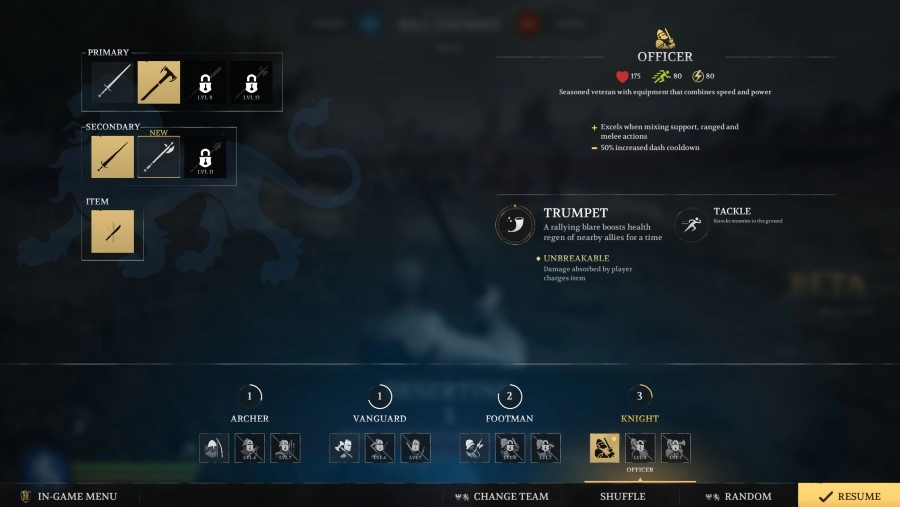 Omdat de game uit twee fracties bestaat, kun je tijdens een gevecht wisselen van team. Hetzelfde geldt voor de vier verschillende klassen die er zijn. Hoe meer je dezelfde klasse gebruikt, hoe meer je vrijspeelt voor deze klasse. Als boogschutter begin je automatisch met een set pijlen en een boog, terwijl de ridder juist een tweehandig slagzwaard heeft. Elke klasse heeft daarbij een speciale vaardigheid. De ridder kan op zijn hoorn blazen, waardoor de gezondheidsbalk van teamgenoten die in de buurt zijn gedeeltelijk wordt gevuld. De boogschutter heeft dan weer toegang tot vuur. De grote vraag die ik dan wel heb, is waarom boogschutters überhaupt een onderdeel zijn van de game. Het is logisch dat beide groeperingen hier gebruik van maken, maar in de game is het niet heel prettig. Ze zijn namelijk zowel veel te sterk als waardeloos. Sterk, omdat je als speler de pijlen niet kunt blokken zonder schild. Hierdoor gebeurt het vaak genoeg dat je druk aan het vechten bent en er opeens een pijl in je rug steekt. Aan de andere kant moet je als boogschutter altijd op afstand blijven, anders word je zo in de pan gehakt. Dat je terug moet rennen naar een bevoorradingskist om de pijlen aan te vullen, is ook niet altijd even veilig.