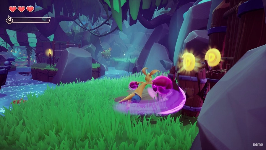 In mijn speelsessie werd ik meegenomen naar The Dark Forest, waarvan ik vermoed dat het het eerste level in de game is. De game voldoet direct aan het plaatje van een moderne 3D-platformer. Een aangename grafische stijl? Check. Verzamelobjecten die verspreid liggen over het level? Ook aanwezig. Een leuke moveset om mee rond te klooien? Paraat. Je wordt als speler niet direct in het diepe gegooid. Beetje bij beetje worden de belangrijkste vaardigheden die Kao heeft, uitgelegd. Het merendeel van de tijd verplaats je je met de dubbele sprong en de rol. Ook zijn bokshandschoenen heeft Kao niet voor de sier. Je kunt ze gebruiken om dozen, objecten en natuurlijk je vijanden een flinke mep te verkopen. Voor je het weet, heb je de gehele kikkerpopulatie al uitgemoord.