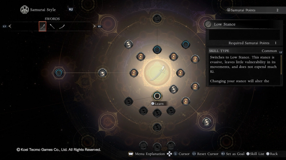 Beide klassen hebben ook hun eigen verschillende vaste wapens. Zo heeft de samoerai beschikking over swords, spear, odachi en de ninja over dual ninja swords, kusarigama en talons. In verhouding met de eerdere games zijn dit nog niet heel veel wapens, maar ik ga ervanuit dat je in de volledige game meer kunt vrijspelen en dat er traditiegetrouw in elke DLC een nieuw wapen wordt aangeboden. Al loop ik enigszins op de zaken vooruit. De samoerai heeft in het begin ook alleen maar toegang tot de midden stance in tegenstelling met de eerdere games waarbij de drie stances meteen beschikbaar zijn. In het begin schrok ik even, omdat het erop leek dat de vertrouwde mechaniek niet aanwezig was. Gelukkig begin je gewoon erg basic en moet je de andere stances met skill points vrijspelen. Het lijkt erop dat wanneer je dit voor één wapen doet dat deze algemene skill voor de andere wapens ook geactiveerd wordt. Daar ben ik zeer blij mee, want dan kan ik die punten weer in een andere skill stoppen.