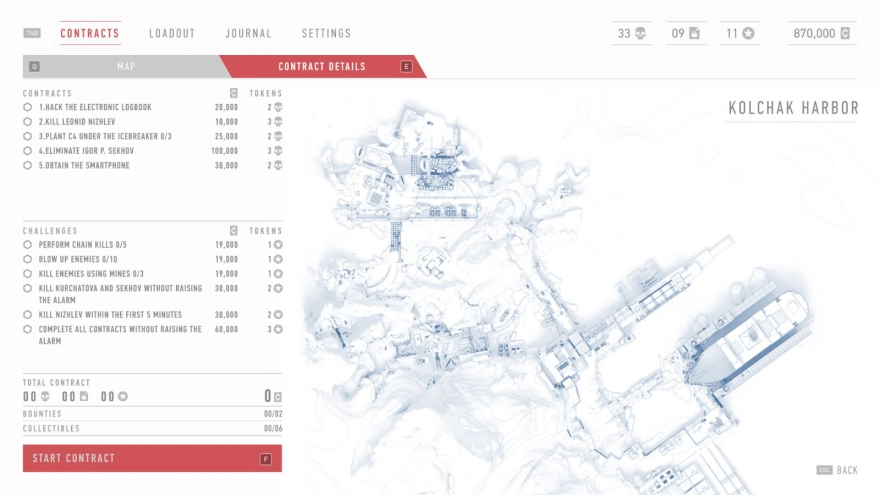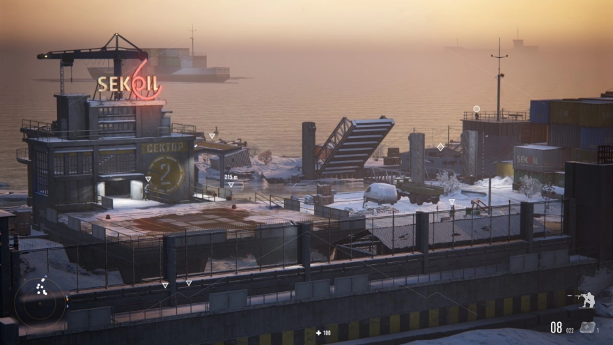 Kolchack Harbor is zoals de naam al doet vermoeden een haven wat ook betekent dat er opslag huizen te vinden zijn. In Kolchack Harbor zijn er vijf contracten die je moet voltooien. In totaal lopen er drie doelen op de map, het koppel is gecombineerd tot één contract, maar het vinden van de telefoon die ze bezitten is een losstaand contract. Qua contracten op de map is er dus voldoende afwisseling en ik mocht zelf bepalen welk contract ik als eerste voltooide. Ren je eerst naar de dichtstbijzijnde haven om Igor P.Sehkov naar de andere wereld te helpen? Of probeer je eerst een laptop te hacken om vervolgens wel te zien waar je uitkomt. Wanneer een contract is voltooid, word je verplicht om naar een bepaalde zone te lopen. Na een contract worden twee zones aangewezen waarvan je er maar één hoeft te bezoeken. Hier deel je namelijk alle informatie van het contract met je baas en wordt het contract afgevinkt. Als beloning krijg je vervolgens een bak geld en tokens.
