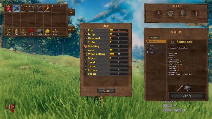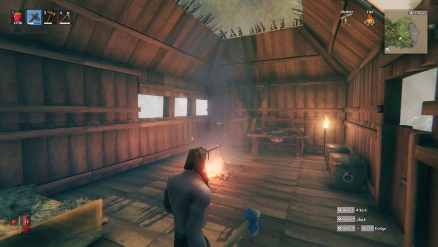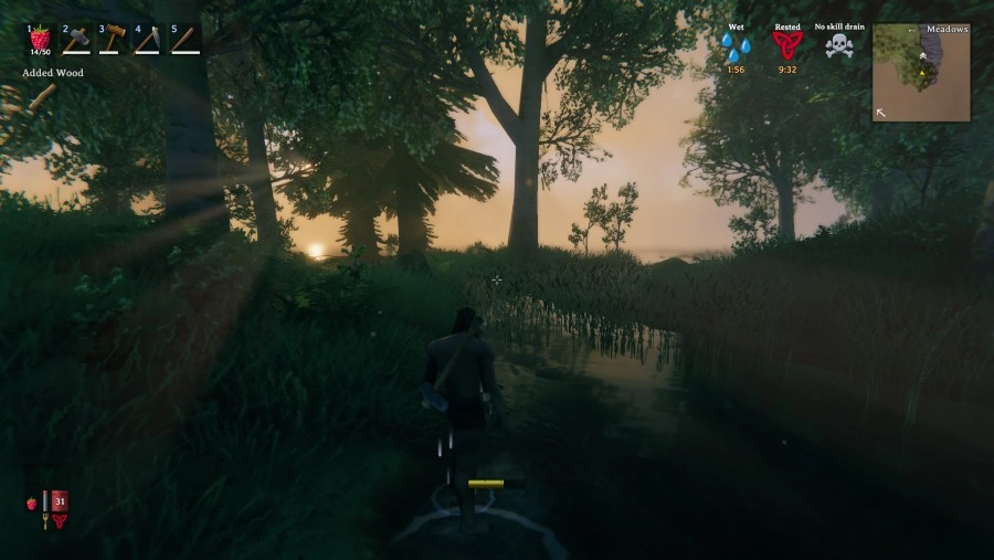 Allemaal leuk en aardig dat je gestorven bent als strijder en vervolgens nog eens de Forsaken een kopje kleiner moet maken, maar de eerste uren ben je voornamelijk bezig met overleven. Valheim is een survival game, dat voornamelijk gefocust is op het hongersysteem. Dit systeem is trouwens interessant, want je personage kan niet hetzelfde voedsel blijven eten. Je zult er dus altijd voor moeten zorgen dat je verschillende soorten voedsel bij je hebt. Het enige nadeel hiervan is dat een bes gelijk staat aan een stuk vlees. Vooral in het begin ben je afhankelijk van bessen en paddenstoelen, dus hier mogen ze wel wat aan veranderen. Dorst kennen ze in Valheim niet, maar de kou is wel iets wat je moet bestrijden. Je personage wordt nat na het zwemmen of als het regent en in de avond daalt de temperatuur. Dit heeft nadelige gevolgen voor je uithoudingsvermogen, waardoor het handig is om vuur te maken. Je personage heeft al een slechte conditie, dus je wilt voorkomen dat je nog amper kunt rennen. Gedurende de game wordt jouw personage wel sterker door het level-systeem. Hoe meer je een bepaalde activiteit, zoals rennen, uitvoert hoe hoger je level uiteindelijk wordt. Doodgaan zorgt er echter wel voor dat je een deel van deze vaardigheden verliest.