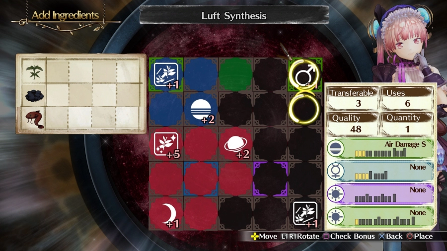 Het alchemie systeem doet denken aan dat van Atelier Sophie. Je verzamelt weer recepten door bepaalde vijanden te verslaan, materialen te verzamelen en bepaalde acties uit te voeren. Door je alchemie level te verhogen kun je steeds betere items maken en door quests te voltooien ontvang je Idea Points waarmee je recepten kunt kopen zonder aan de vereisten te voldoen. Je moet weer blokken in een grid plaatsen en hierdoor kun je de synthese van de items optimaliseren waardoor ze bijvoorbeeld meer energie herstellen. Door de toevoeging van Catalysts kun je bepaalde lijnen veranderen en door de blokken met de juiste kleur op de gekleurde lijn te zetten, wordt de kwaliteit van je items nog beter. Later kun je met een nieuwe techniek, Mass Synthesis, een zeer ingewikkelde synthese uitvoeren, maar je moet hiervoor wel het precieze aantal aangegeven items van een goede kwaliteit hebben om dit te bewerkstelligen. Ook kun je met het Atelier Making systeem je werkplaats aanpassen waardoor Firis bijvoorbeeld meer items kan verzamelen en kun je later in de game het kostuum van Firis aanpassen waardoor bijvoorbeeld je LP consumptie wordt verminderd.