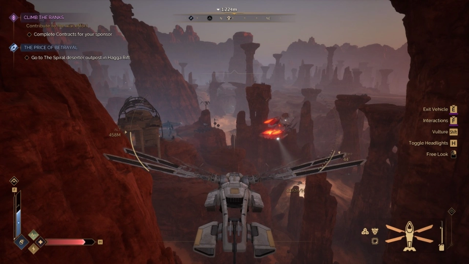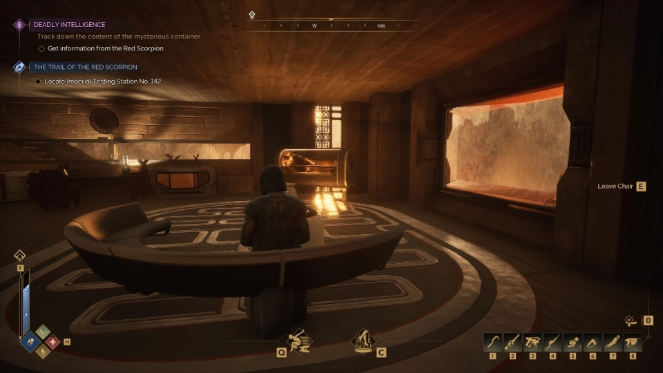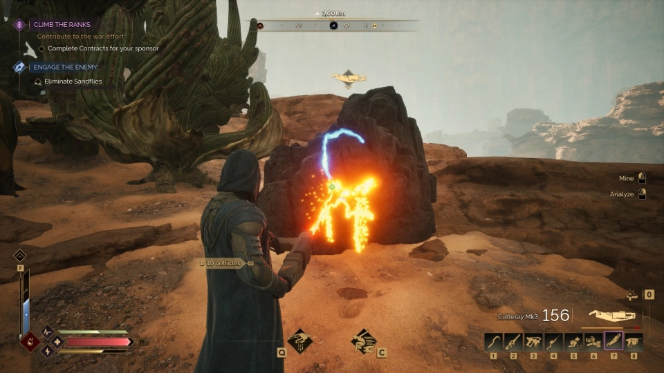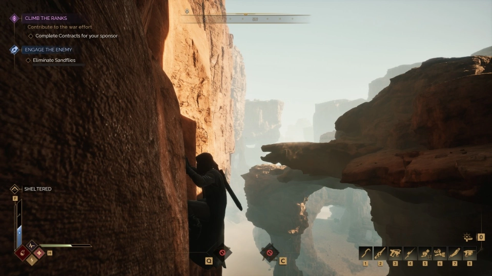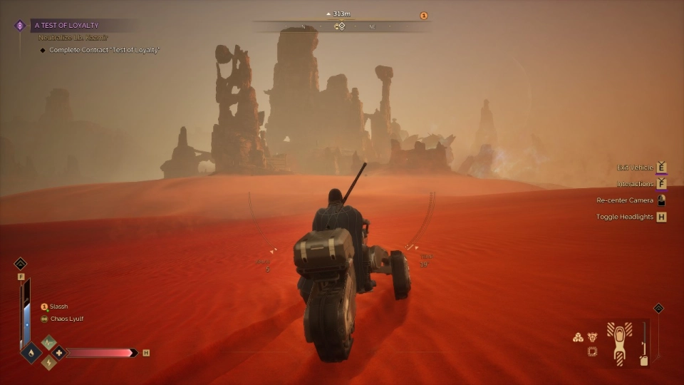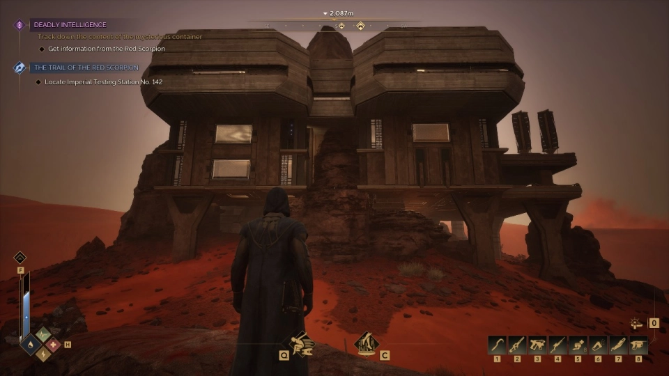 Als het gaat om de quests ben je voornamelijk bezig met de contracten die te vinden zijn in de Trading Posts, de contracten die je krijgt van de trainers en de contracten van je Fraction. De quests die je ophaalt bij de Trading Posts kun je zien als een manier om geld of materialen te verdienen. Je wordt eigenlijk ingehuurd om een object te vinden of wraak te nemen. De contracten bij de trainers zijn voor de gameplay het belangrijkst. Het is in Dune: Awakening namelijk mogelijk om alle classes vrij te spelen en daardoor kun je hun passieve en actieve abilities met elkaar combineren. Dit is niet gratis, want ze sturen je altijd op pad om enkele taken uit te voeren. Het vrijspelen van een class is redelijk eenvoudig, maar als je de skills wilt upgraden dan moet je naar een advanced trainer. Die quests kosten vaak meer tijd. De resterende quests haal je bij één van de twee Factions. Het is aan jou om te kiezen uit House Atreides en House Harkonnen. Atreides wordt gezien als een huis waar eer en diplomatie een grote rol spelen. Door de War of Assassins moeten ze echter ook buiten hun idealen handelen. House Harkonnen wordt vaak gezien als de vijand en is meer gericht op intimidatie, macht en het controleren van de bevolking. Als beloning voor het voltooien van de quests krijg je reputatie, waarmee je toegang krijgt tot skins voor voertuigen en decoraties voor je huis. Voor het multiplayer-gedeelte is je faction het belangrijkste. Je kunt als House Atreides namelijk niet lid worden van een guild die Harkonnen aanhangt. Als guild strijd je voor de macht in de Landsgraad en kun je stemmen op wetten. Deze wetten geven vaak handige bonussen. Je kunt Dune: Awakening echter volledig solo spelen of met een kleine groep. Hierdoor voelt de Langsgraad nogal karig aan voor die selectie spelers, want het draait vaak om pvp en werkt alleen als je aan het no-lifen bent. De quests zijn dus een belangrijk onderdeel van de gameplay, maar diepgaand zijn ze niet. Er wordt hier en daar wel gestrooid met de lore van Dune, maar het zijn voornamelijk fetch-quests. Vooral de fracties sturen je van hot naar her om een object of persoon te vinden. Wat ergerde ik me dood toen ik naar de dieptes van Hagga Rift moest om daar een object op te rapen. Je moet dan eerst weer helemaal uit het ravijn klauteren of rijden om vervolgens naar de Trading Post te reizen. Mijn beloning? Een nieuwe quest die mij weer naar de bodem van Hagga Rift stuurde. Je moet niet te veel verwachten van de quests en kunt beter een route uitstippelen, zodat je altijd meerdere quests per ronde kunt doen. Anders blijf je aan het reizen. Het is daarnaast beter om zoveel mogelijk quests op te halen, want anders moet je bepaalde locaties nogmaals verkennen.