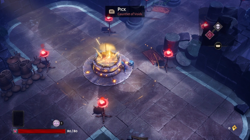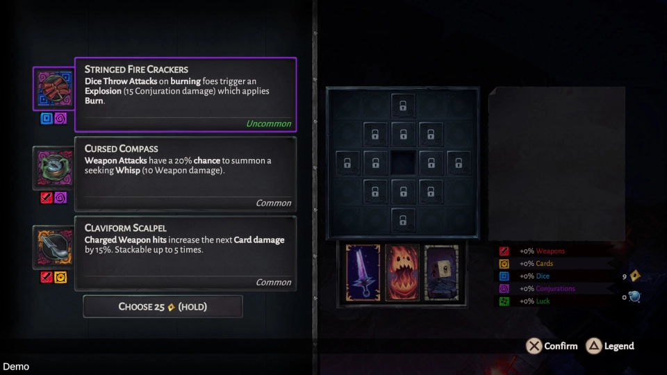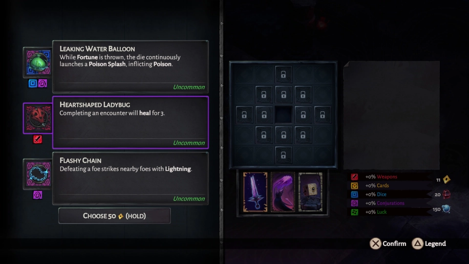 Niet alleen de speciale kamers leveren items op. Ook na het verslaan van alle vijanden verdien je één van de volgende items: Relic Coffer, Pearls Coffer, Pip Dust, Cinder, coins of Health Restore of upgrade. In een Relic Coffer kun je kiezen uit één van de drie Relics die toegang tot bepaalde vaardigheden geeft. Om deze te activeren moet je deze plaatsen op een grid. Zo krijgt bijvoorbeeld je dash een explosief einde of zorgt het vasthouden van Fortune voor een regelmatige magische aanval. Elke Relic heeft een bepaalde kleur of kleuren en deze corresponderen met een bonus. Dit betekent dat als je drie van dezelfde kleur naast elkaar hebt staan, je een stat boost (Luck, Dice, Attack, Magic) verdient. Aan de gekleurde Pearls zit geen skill verbonden, maar ze helpen om de stats te boosten. Alleen verdwijnen ze van het grid als drie van dezelfde kleur op een rij staan. Je kunt ook een nieuwe Relic over een oude plaatsen. Echter verlies je dan de oude skill, maar behoud je de stat boost.