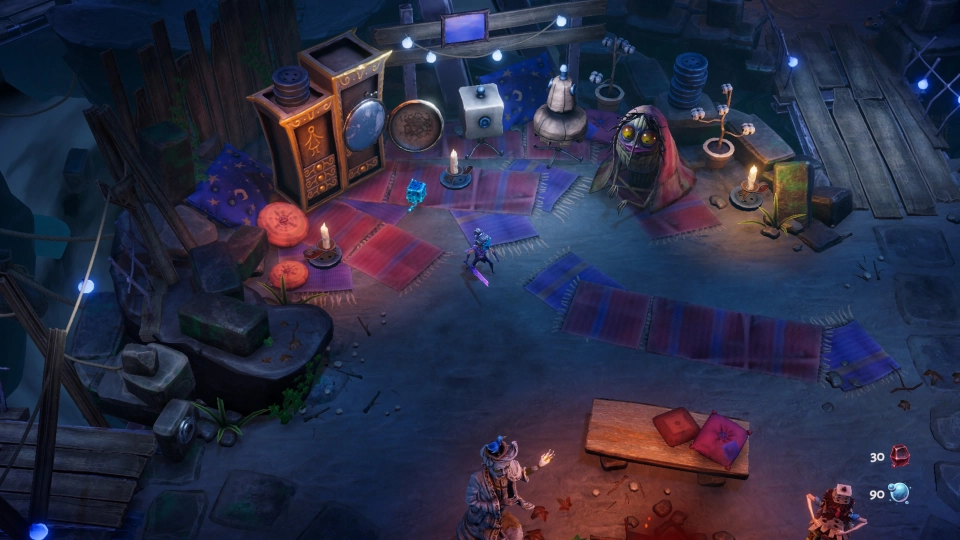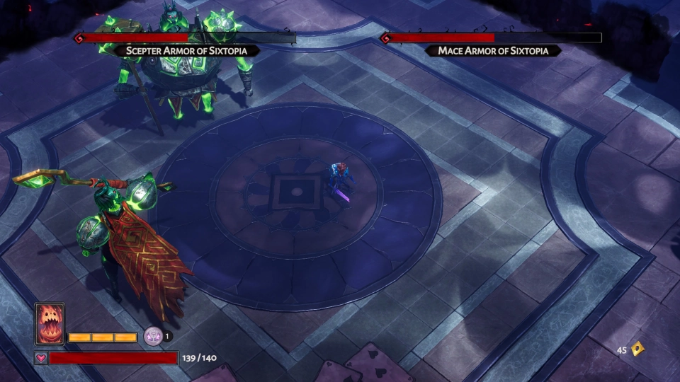 Als je de eerste eindbaas tegenkomt, maakt die niet veel indruk. Het zijn verre familieleden die geen fan van je zijn en er niet sterk uitzien. Dat verandert als het gevecht begint, want ze veranderen in de twee grote reuzen: The Scepter Armor of Sixtopia en The Mace Armor of Sixtopia. Dit is niet altijd zo, want het viel me op dat ze soms een ander wapen dragen. Hierdoor moet je je speelstijl aanpassen en kun je niet steeds dezelfde routine herhalen. Wat ook opviel, is dat Aleksandra een verleden met elke baas heeft. Zo is de tweede eindbaas Eema familie van Aama die Aleksandra in het verleden heeft verslagen en blijkbaar in The Black Die heeft opgesloten. Als je eenmaal hun patroon doorhebt, worden de gevechten eenvoudiger. Toch was Mare, The Knight niet een eenvoudige baas en mocht je nu toch het onderspit delven dan kun je de gevonden Pip Dust en Cinders in The Sanctuary inleveren. Hier vind je NPC’s die je in The Black Die bent tegengekomen en richting Santuary hebt gestuurd. Zij zorgen voor wat meer achtergrond en kunnen helpen met de permanente upgrades zoals Aama of Rack en andere outfits. Na het upgraden ga je weer terug naar het strijdtoneel totdat je de Mare, The Knight verslagen hebt.