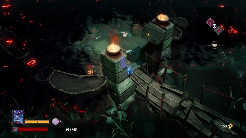 Met de Pip Dust koop je bij Maara Blessings waarmee permanent je stats boost. Elke Blessing bestaat uit twee opties en je kunt er elf actief gebruiken. Je hebt dus de keuze uit tweeentwintig Blessings die je naar voorkeur kunt kiezen. Zo kun je bijvoorbeeld kiezen om je max health te verhogen of om dit te doen met de Shard of Vitality en om de Attack damage boosten tegen alle gewone vijanden of alleen de eindbazen. De Cinders kun je gebruiken om je wapens bij Rack te upgraden of de andere drie bij hem te kopen. Elk wapen heeft vier categorieën met drie stats die je kunt boosten. Tijdens het spelen kan er maar één van deze vier actief zijn. Ga je voor meer damage en critical damage, extra magische schade of voor een health restore. In je eerste pogingen is het belangrijk dat je zoveel mogelijk Pip Dust en Cinders verzamelt, want deze upgrades zijn van noodzaak als je op Normal een kans wilt maken.