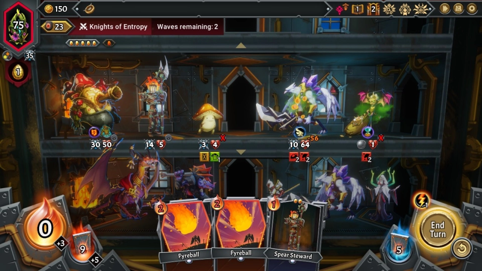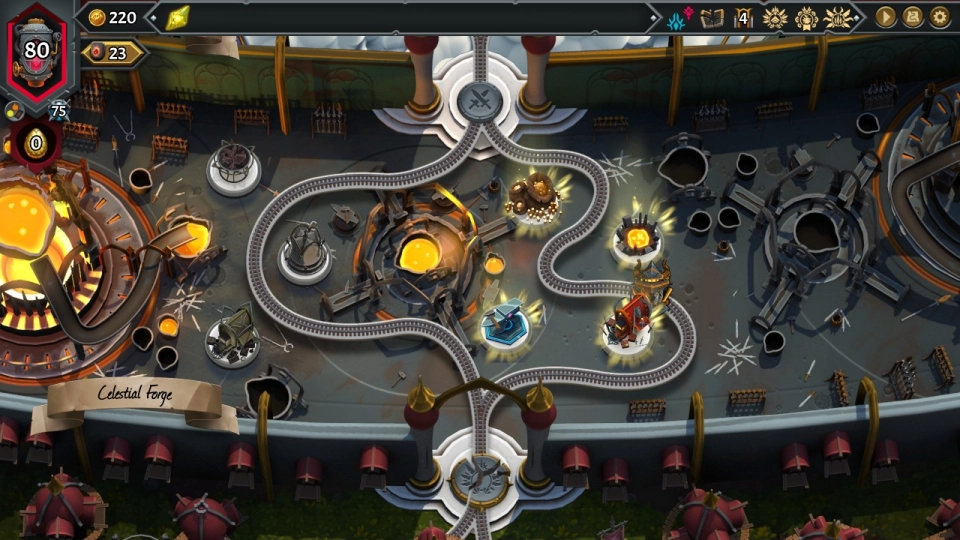 De trein is niet te vergelijken met de standaard treinen van de NS, want je hebt drie verdiepingen. Op de vierde verdieping staat de Pyre Heart die een beperkte hoeveelheid schade kan incasseren. De Pyre Heart doet ook schade aan de vijanden dus het is niet direct een probleem als een soldaat de Pyre Heart weet te bereiken. Wanneer die echter kapot wordt geslagen, is je poging over en mag je weer lekker opnieuw beginnen. Het is dus aan jou om je eigen eenheden te verdelen over de verdiepingen, want de vijanden klimmen omhoog. Het probleem met die keuze is dat je Champion vaak weinig gezondheid heeft en dat sommige soldaten meer kunnen incasseren dan een ander. Het heeft geen zin om een draak vooraan te zetten als hij maar vijf hartjes heeft. Met behulp van spreuken en equipment kun je tijdens een gevecht je eenheden boosten of juist direct schade aan de vijand doen. Denk daarbij aan het toevoegen van armour en het herstellen van hun gezondheid. Er zijn veel verschillende spreuken, waarbij de draken Pyregel aan vijanden kunnen toevoegen, waardoor ze per stack meer schade oplopen. Je kunt zelfs kamers vrijspelen die een verdieping van een trein compleet veranderen. Dan heb ik het niet alleen over het uiterlijk, maar ook over de bonussen die het geeft. Er is dus meer dan genoeg keuze, maar je kunt niet vrijblijvend alle kaarten gebruiken. Je hebt per ronde drie tot zes Amber om te besteden en kaarten kunnen nul tot vier Amber kosten. Daarnaast moet je rekening houden met de eenheden, want op elke verdieping kun je vijf punten aan eenheden kwijt. Heb je dus een soldaat die drie punten kost dan kun je alleen nog een eenheid van twee punten of twee eenheden van één punt neerzetten. Gedurende een potje kun je de kosten van een eenheid verlagen en kun je een kristal verdienen om meer soldaten kwijt te kunnen op een verdieping.