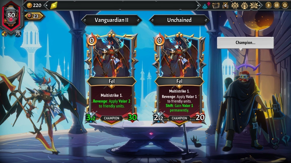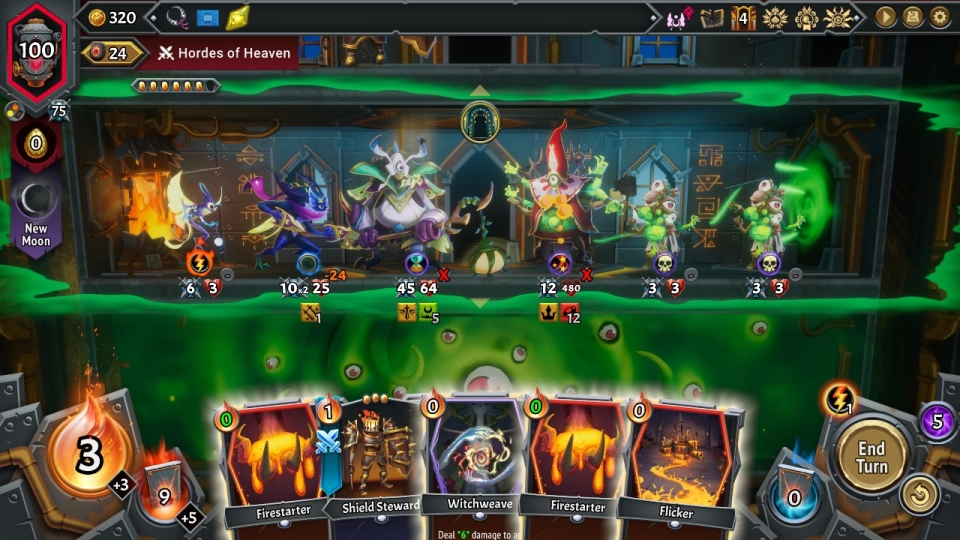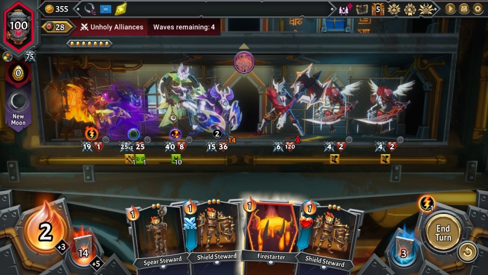 Het hele idee van Monster Train is dat je met twee clans een poging doet om het einde van de Hemel te bereiken. Je bepaalt zelf welke clans dit zijn, maar de clan die je als eerste selecteert levert de Champion. De Clans zijn verschillend en hebben daardoor ook een ander design. Vooral de eenheden van de Pyreborne, Luna Coven en de Underlegion zien er gaaf uit. Het design is creatief en soms schattig te noemen, en dat is een groot voordeel als je meerdere pogingen onderneemt. Ik ben minder fan van de Banished eenheden, al heeft dit weinig te maken met de bonussen die ze hebben. Doordat je twee clans met elkaar kunt combineren zijn er ongelooflijk veel combinaties mogelijk. Ik koppelde de Pyreborne en Luna Covens regelmatig aan elkaar tijdens mijn pogingen en had daar ook het meeste plezier mee. In ieder geval tot ik de paddenstoelen vrijspeelde. Het unieke van de Pyreborne is dat je gouden eieren moet verzamelen. Na een gevecht krijg je de keuze of je deze wilt inleveren voor geld en artefacten of dat je ze bewaart om betere beloningen binnen te slepen. Hoe meer geld en gouden eieren je hebt, hoe sterker sommige draken zijn. Je moet bij deze clan dus echt als een draak denken en vooral hoarden. Bij de Luna Coven ben je gebonden aan de status van de maan. Haar soldaten doen bij een halve maan extra schade of je Champion krijgt extra Conduct. Dit betekent dat je spreuken veel meer schade doen op de verdieping waar zij staat. Zo heeft elke clan zijn eigen bijzonderheden die een poging totaal verschillend maken. Enkele soldaten hebben nu ook een actieve ability die je zelf moet activeren. In het begin maakte ik regelmatig de fout om deze te vergeten. Aangezien de abilities een cooldown hebben, is het juist handig om ze te gebruiken.