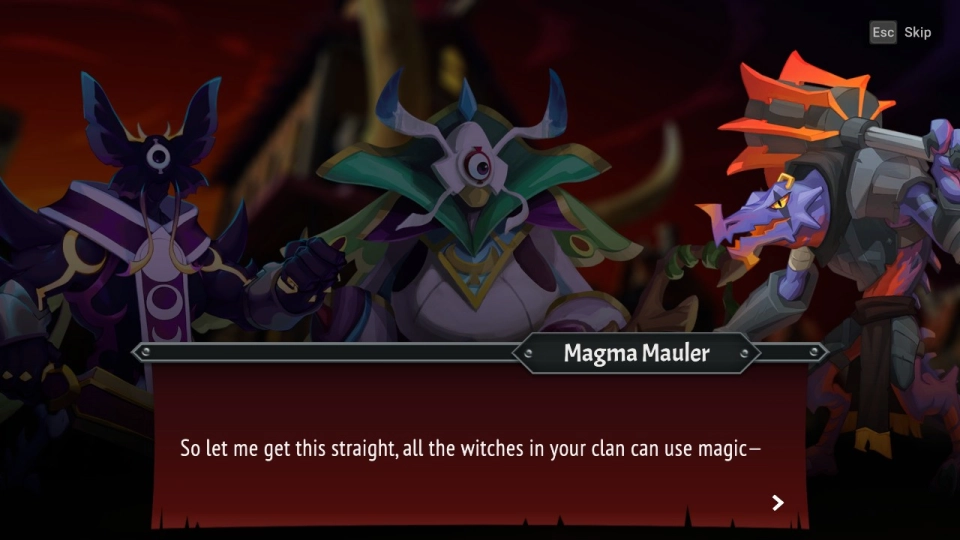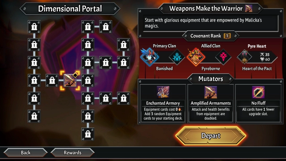 De Covenant Outpost is uiteraard de plek waar je een nieuwe poging opstart, maar het is ook de plek waar je bij de Dimensional Portal extra uitdagingen krijgt aangereikt. Met elk level bepaalt de game wat voor clans je mag gebruiken en wat de modifiers zijn. Weet je level een af te ronden dan krijg je toegang tot een nieuw level. Dit speelt dus heel anders dan de normale pogingen die je onderneemt. De Daily Challenges gebruiken ongeveer hetzelfde principe, maar verversen elke dag. In de Library kun je vervolgens bekijken wat je allemaal hebt bereikt met je pogingen. Het is de plek waar je kunt zien hoeveel kaarten je per clan hebt vrijgespeeld, welke artefacten je al hebt gevonden, wat je clan level is en welke vijanden je kunt tegenkomen. Het is ontzettend handig om even terug te blikken wat een Champion upgrade ook alweer doet en hoe ver je bent met het vrijspelen van een nieuwe clan. Je begint namelijk automatisch met de Banished en Pyreborne Clan. Om de Luna Coven, Underlegion en Lazarus League vrij te spelen moet je tijdens je poging specifieke kaarten spelen. Voor de Luna Coven, die ik tot Moonies heb omgedoopt, moet je vijanden verslaan met behulp van de Spell-kaarten. Het progressiesysteem in Monster Train 2 is daardoor bevredigend, want je speelt altijd nieuwe zaken vrij. Ook als je niet weet te winnen. Door nieuwe kaarten en artefacten te gebruiken breid je de collectie uit. Wanneer een Clan een nieuw level behaalt, speel je nieuwe kaarten vrij voor die clan en bij level vijf krijg je toegang tot de tweede Champion. Dat is echter niet alles, want je kunt nu nieuwe Pyre Hearts voor je trein vrijspelen. Deze brengen niet alleen nieuwe bonussen, maar zorgen er ook voor dat het verhaal verder gaat. In totaal kun je dertien Pyre Hearts vrijspelen en dat zal niet altijd even gemakkelijk gaan. Fans van het eerste deel kunnen na het vrijspelen van deze Pyre Hearts genieten van enkele mooie verrassingen die te maken hebben met de oudere clans.