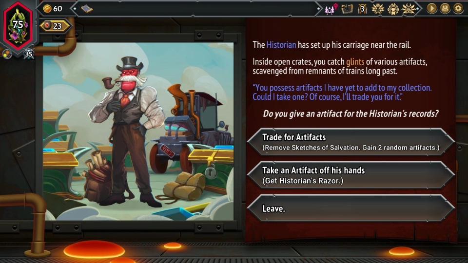 Elk gevecht bestaat uit enkele rondes waarbij je altijd eindigt met een miniboss. Tijdens een volledige poging kom je drie eindbazen tegen. Net zoals jij hebben alle vijanden en eindbazen toegang tot bonussen. Je kunt dus niet telkens dezelfde strategie gebruiken en daar word je sowieso in beperkt. Monster Train 2 is namelijk een roguelike deckbuilder en daar speelt RNG een grote rol in. Je begint standaard met dezelfde kaarten van je Champion, maar daarna kun je na een gevecht een kaart kiezen uit een kleine selectie. Je weet dus nooit wat je krijgt en ook tijdens de gevechten weet je niet welke kaarten in je hand verschijnen. Daardoor is het extra belangrijk om in de korte pauzes de juiste route te bepalen. Na een gevecht kun je naar links rijden of juist rechtsaf slaan. De opties die aan beide kanten van de rails worden aangeboden bepalen welke kant je opgaat. Zo zijn er winkeliers die artefacten, upgrades voor eenheden en upgrades voor spreuken aanbieden tegen een betaling. Het is maar net welke je op dat moment het hardst nodig hebt. Daarnaast zijn er kisten met artefacten, kamers en geld die erg handig kunnen zijn. Een enkele keer kun je de hartjes van de Pyre Heart herstellen. Heeft je Pyre Heart geen schade opgelopen dan hoef je die kant niet op, maar anders kan het zomaar zijn dat die beslissing je poging redt. Het is tijdens deze momenten dat je van de twee gekozen clans nieuwe eenheden kunt vrijspelen. Een poging met te veel eenheden kan je kansen verkleinen, terwijl hetzelfde geldt als je te weinig eenheden hebt. Je zult dus telkens de balans moeten opmaken. Hierdoor is de speciale Pyre Heart waarmee je bij elke winkelier kaarten kunt dupliceren mijn favoriet geworden, omdat ik niet meer afhankelijk was van route. Voor wat extra willekeurigheid zijn er events, waarbij je meer te weten krijgt over de gebieden en wordt beloond met nieuwe kaarten, artefacten of bonussen. Op andere momenten word je daar dan weer voor bestraft. Bij deze Celestial Coves is het duidelijk waarom Balatro een samenwerking heeft met Monster Train 2, want je kunt een paar Jokers vrijspelen.