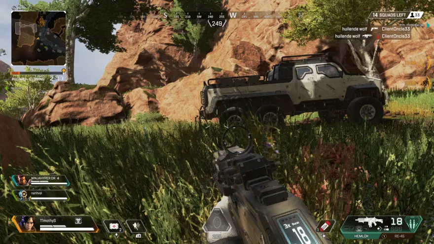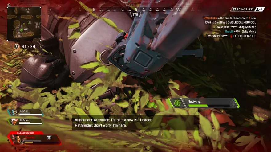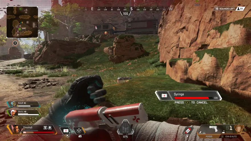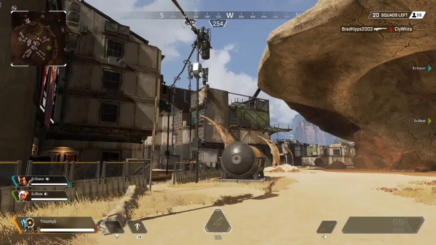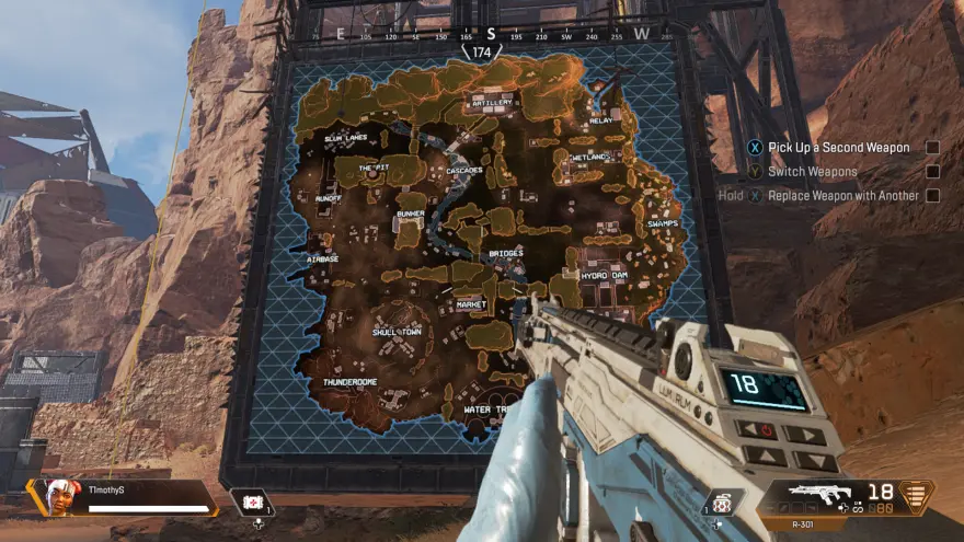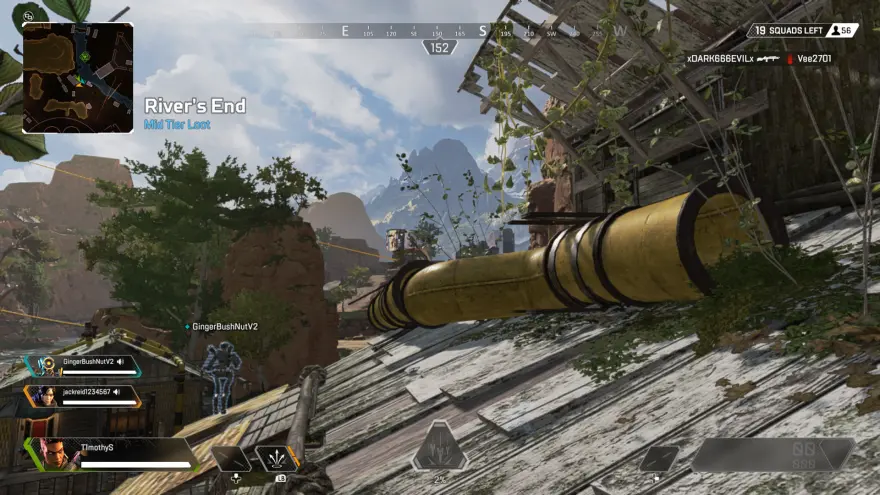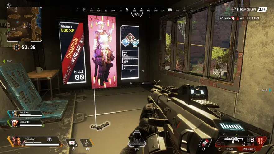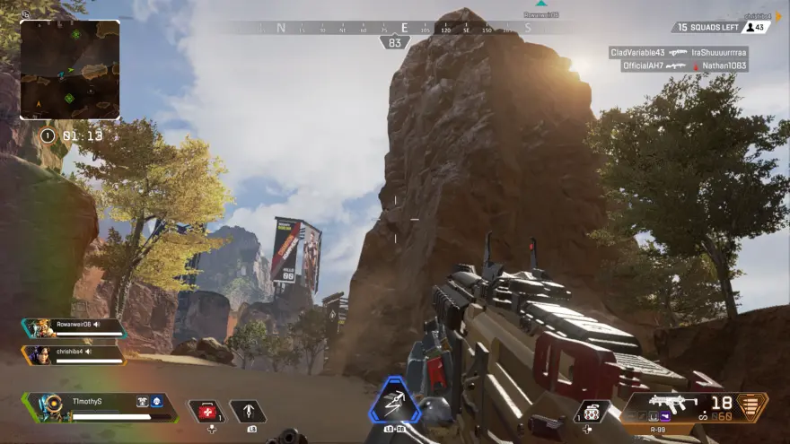 Of dit dan zo verstandig is, moet maar blijken. Want tijdens het springen, heb je een gekleurde rookpluim uit je reet waardoor je overduidelijk te zien bent. Iedereen kan zo zien welke teams zich in het begin van de game bevinden. Het loont dus echt om bij je team te blijven. Samen sta je immers sterker. Verder volgt het een aantal bekende paden. Wapens, ammo, bescherming en bonussen vind je her en der verspreid over King’s Canyon. Alvorens de ronde echt van start gaat, dien je jezelf zo goed mogelijk te bewapenen. De wapens zijn de bekende zoals Assault Rifles, Shotguns, SMG’s enzovoorts. Zodoende kan jij je sterker maken, naast de vaardigheden die jouw personage heeft. Er zijn acht verschillende personages met dus elk hun eigen unieke vaardigheden. Zo heb je Bangalore als Professional Soldier. De naam verraadt het al, je bent dus een allround soldaat goed voor het schietwerk. Haar unieke vaardigheden stellen haar in staat om sneller te rennen of artillerievuur op het slagveld te krijgen. Pathfinder (mijn favoriet) is de Forward Scout om sneller over het veld te gaan middels de Grappling Hook die ook te gebruiken is door je team. Zo kan ik nog wel even doorgaan, maar het is echt lonend om elk personage in de vingers te krijgen, omdat de balans van je team hiervan echt beter wordt.