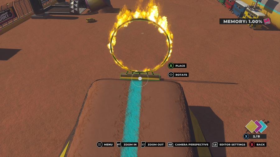 Je kan natuurlijk ook zelf even aan de slag met de grote zandbak. De opties die je voorgeschoteld krijgt, zijn divers genoeg als het gaat om bouwen. Gewoon wegstukjes om leuke tracks te bouwen en genoeg andere onzin voor de ambiance. Het bouwsysteem werkt redelijk goed. Je kan gemakkelijk tussen de items door schakelen en jouw ideeën voor een toffe baan verwerkelijken. Het is af en toe wel lastig om bepaalde onderdelen met elkaar te verbinden. Zeker als het gaat om iets bouwen in de hoogte, of blokjes proberen te verbinden die wellicht eigenlijk niet zo goed samengaan. In het algemeen ben ik echter zeer te spreken over deze toevoeging. Hopelijk blijft Codemasters er wel genoeg content aan toevoegen. Want het moment dat de community klaar is met de gamemodus, dan valt het hele partijtje in het water.