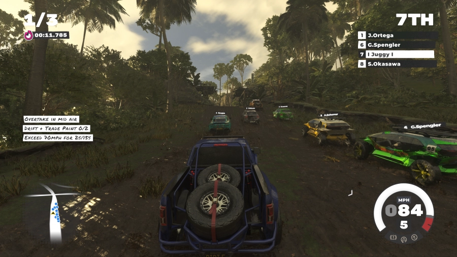 Dit komt mede ook door de diverse races die in de singleplayer zijn gestopt. Het ene moment race je in een klassiek drie ronden circuit, maar het andere moment kan je in je eentje een berg beklimmen met een buggy, wiens banden groter zijn dan mijn pupillen, nadat ik de verkeerde vitamines had ingeslikt. Geloof me, dat is best groot. Dankzij de diverse line-up aan races verveel je je geen moment. Zeker niet wanneer ze gecombineerd worden met de vele exotische landschappen. Het ene moment ben je in Brazilië door de modderstroom aan het racen, maar dat kan de volgende race compleet anders zijn. Zoals in het berggebied van Marokko, waar de stofwolken je om de oren vliegen. Doordat er zoveel verschillende werelddelen worden ingezet, voelt elke race weer als een nieuw avontuurtje aan.