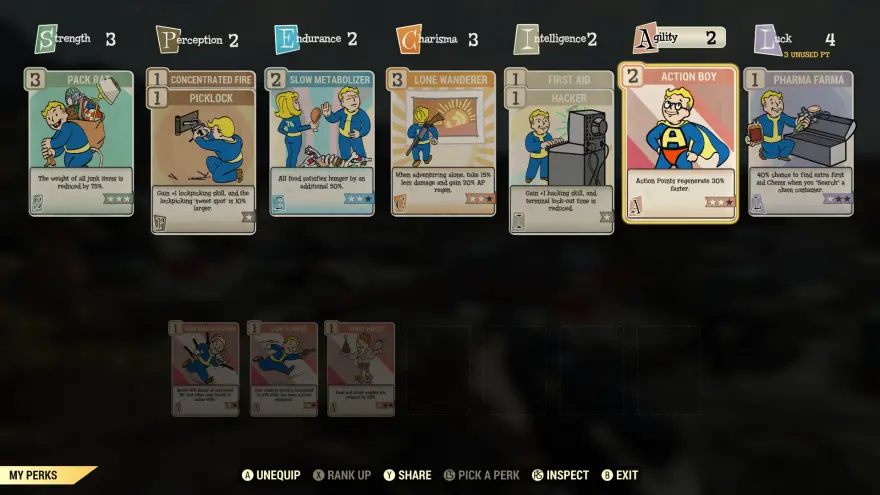 Toch heeft Bethesda het roer met 180 graden omgegooid. Want van de buitenkant lijkt Fallout 76 precies hetzelfde, maar toch is niets minder waar. Als eerste maar even het meest belangrijke: deze game is volledig online. Virginia deel je continu met medespelers die zich op onze real-life aardbol bevinden. Je wordt met een aantal spelers tegelijkertijd op een server gegooid en het is aan jullie om deze wereld bij voorkeur samen te verkennen. Todd Howard heeft te kennen gegeven dat het aan de spelers is om deze wereld verder in te vullen, waarin niets moet en alles mag. De tweede grote verandering is dat er geen NPC’s zijn, waardoor de game bizar levenloos aanvoelt, hoe tegenstrijdig dit ook klinkt voor een online game. Het derde punt is het aantal gebouwen en plekken dat je kunt ontdekken. Dit zijn er gigantisch veel en weer een traditioneel groot pluspunt van Fallout. Dat pretpark met de grote attracties? Ja, kan je heen. Die grote vuurtoren? Kan je op. Maar het grootste gedeelte kan je niet van binnen verkennen; het is wat oppervlakkiger. Tot slot een grote verandering is hoe SPECIAL wordt toegepast. Je krijgt kaarten met vaardigheden, die je selectief moet kiezen. Per punt dat jouw vaardigheid sterk is, kan jij van die waarde een hoeveelheid kaarten besteden. Elke kaart is één punt waard of worden beter en daarmee stijgen ze ook in punten. Dit zorgt ervoor dat je geen eenmansleger wordt zoals in de singleplayer games, want dit zou online niet werken.