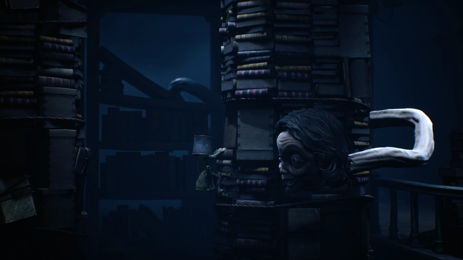 De trailers laten je meteen zien waar het budget in gestoken is en dat zijn de graphics, kunstdirectie en de animaties. Little Nightmares II is een audiovisueel hoogstandje. Ik heb altijd al een zwak gehad voor games met geweldige atmosfeer en Little Nightmares II scoort hier een dikke voldoende. De hele wereld voelt verrot aan, met geweldige monster designs en subtiele details, waardoor je ziet dat de ontwikkelaars heel nauwkeurig te werk zijn gegaan. Als je maar lang genoeg naar de achtergrond kijkt, dan zie je elke keer wel weer iets verknipts terug staren. Een wereld die eigenlijk een stuk beter zou zijn als de game niet speelde als een hele lineaire ervaring. De game hanteert een 2.5D stijl, oftewel meestal naar links en rechts bewegen en af en toe kan je omhoog en omlaag, zowel verticaal als horizontaal. De game is heel streng met waar je wel heen mag en waar niet, alsof je op een tour bent in een prachtig museum. Wil je weten wat daar staat? Pech gehad, doorlopen. Er zijn wel geheimen te ontdekken, maar niet zo veel, en die zitten verstopt onder een excessief gebruik van het grijs/blauwe filter dat over de wereld hangt. Het is een herhalend concept en ondanks het feit dat het wel de atmosfeer goed onderbouwt, is het niet handig als je wilt exploreren buiten het bewandelde pad. De soundtrack doet zijn werk, maar is niet erg aanwezig. Het sounddesign is sterk. De manier waarop bepaalde monsters klinken, of wat ze met hun slachtoffers uitspoken, is ontzettend vervelend om naar te luisteren. Vervelend op de beste manier dan.