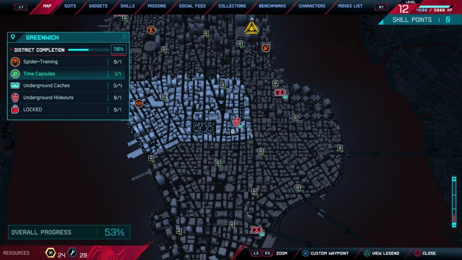 Door je touchpad te swipen, open je je telefoon en kun je de beschikbare zijmissies en misdaden zien en selecteren. Ook zijn er speciale missies waarbij je je nieuwe buurtgenoten kunt helpen en de buurt kunt ontdekken. De misdaden die je in de stad tegenkomt zijn weer terug en vergelijkbaar met die uit het origineel. Denk aan een gestolen auto stoppen of een aantal vijanden uitschakelen die de burgers lastigvallen. Al zijn er ook een paar nieuwe waar je bijvoorbeeld een helikopter moet beschermen. Omdat Peter Parker op vakantie is, heeft hij een aantal holografische oefenstations in de stad verspreidt om Miles te helpen. Naast de experience die je verdient met deze Challenges, zorgt het voltooien van deze uitdagingen voor een verbeterde skill. Zo krijg je met het behalen van een Combat Challenge bijvoorbeeld een langere spin-aanval bij het stelen van de wapens. Bij een Traversal Challenge krijg je een extra boost met de boost launch en word je door het behalen van Stealth Challenge minder snel ontdekt als je gezien wordt. De benchmarks zijn ook weer terug (Wall Runing, Freefall) en als je deze behaalt, krijg je experience en stickers. Door de benchmarks en de tricks heb je altijd wat te doen tijdens het slingeren door de stad en je krijgt er ook nog wat voor.