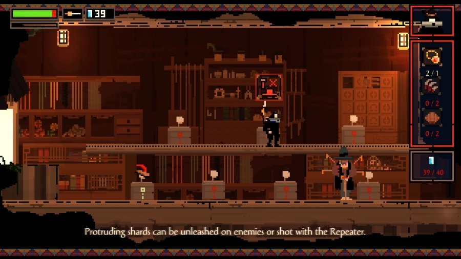 Door het verslaan van vijanden bouw je een speciale meter op waardoor je speciale aanvallen kunt maken met je harpoen of waardoor de speciale techniek van de hoed wordt versterkt. Je kunt deze bewaren voor een baas, maar aangezien de meter snel wordt gevuld, kun je deze ook gebruiken als je overweldigd wordt. Gelukkig is de rapier niet het enige sub-wapen en vind je later in de game meerdere waaronder een kruisboog en een blunderbuss. Je kunt van sub-wapen wisselen met L1, zodat je het juiste wapen tegen de juiste vijand gebruikt. Dit geeft je nog meer mogelijkheden om de vijanden van alle kanten te bestoken. Op afstand met pijlen of van dichtbij door ze weg te blazen met je blunderbuss. Dan nog een harpoen erachteraan en het is snel einde oefening.