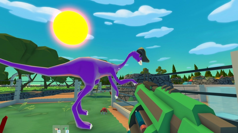 Naast je standaard isometrische weergave, kun je in Parkasaurus ook in first-person door je park rondlopen. Je kunt dan de habitat van je dinosaurus binnenlopen en je prehistorische vrienden van dichtbij bekijken. Je krijgt ook een soort kalmeringspistool mee, waarmee je op je dino's, maar ook op je bezoekers kunt schieten. Een leuke toevoeging, maar het voegt mijns inziens helemaal niets toe aan je gameplay-ervaring. Geef mij dan maar ultrawide ondersteuning en meer hoeden.