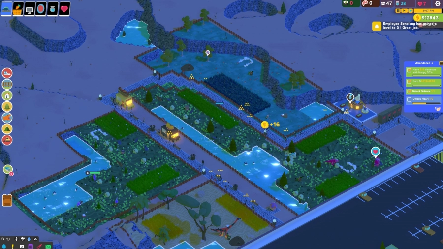 Parkasaurus speelt dus eigenlijk zoals elke andere dierentuinmanagementgame en dat doet het best prima. Ware het niet dat de game in dat opzicht niet erg veel diepgang biedt. Ja, je kunt heel veel dingen zelf tweaken, tot aan het aantal schepjes ijs dat er per dollar verkocht mag worden in je ijskraam aan toe, maar het schijnt allemaal geen drol uit te maken. Gedurende mijn playthrough van de Campaign-modus heb ik nooit in geldnood gezeten en wist ik eigenlijk alle doelstellingen wel te behalen binnen twee in-game weken of minder. De potentie om de diepte in te gaan wat betreft het micromanagen van al je middelen is er wel, maar wordt in mijn ogen te weinig benut. Zo speelde ik de eerste vijf parken van de Campaign-modus uit zonder de ervaringspunten van mijn personeelsleden te spenderen om hun skills op te hogen. Nooit heb ik de behoefte gehad om mijn personeel sneller of efficiënter te laten werken, het park draaide toch wel.