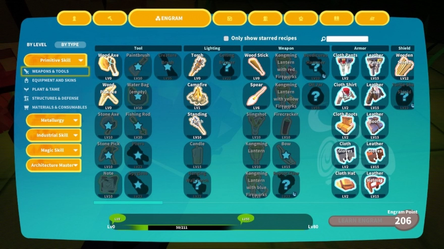 Wanneer je naar een nieuwe zone toe wilt gaan, dan is het dus wel belangrijk dat je goed voorbereid bent. Dit doe je door de juiste uitrusting te maken en mee te nemen. Je moet echter wel eerst leren hoe je deze uitrusting en gereedschappen moet maken. Dit doe je door je personage te levelen. Dit gebeurt op twee verschillende manieren. Enerzijds krijg je passieve Exp, die je gewoon verdient door in de game te zitten. Anderzijds krijg je Exp voor het doen van dingen, zoals het verzamelen van grondstoffen of het doden van een dinosaurus. Het passief verkrijgen van Exp zorgt ervoor dat het overleven in PixARK een stuk relaxter gaat dan in ARK zelf. Je kunt het namelijk gewoon rustig aan doen en een lange tijd in de beginzone blijven. Wanneer je genoeg Exp verzameld hebt, ga je een level omhoog en kun je je personage upgraden en nieuwe recepten vrijspelen. Gaandeweg worden deze recepten steeds complexer, tot aan het bouwen van machines en magische voorwerpen aan toe.